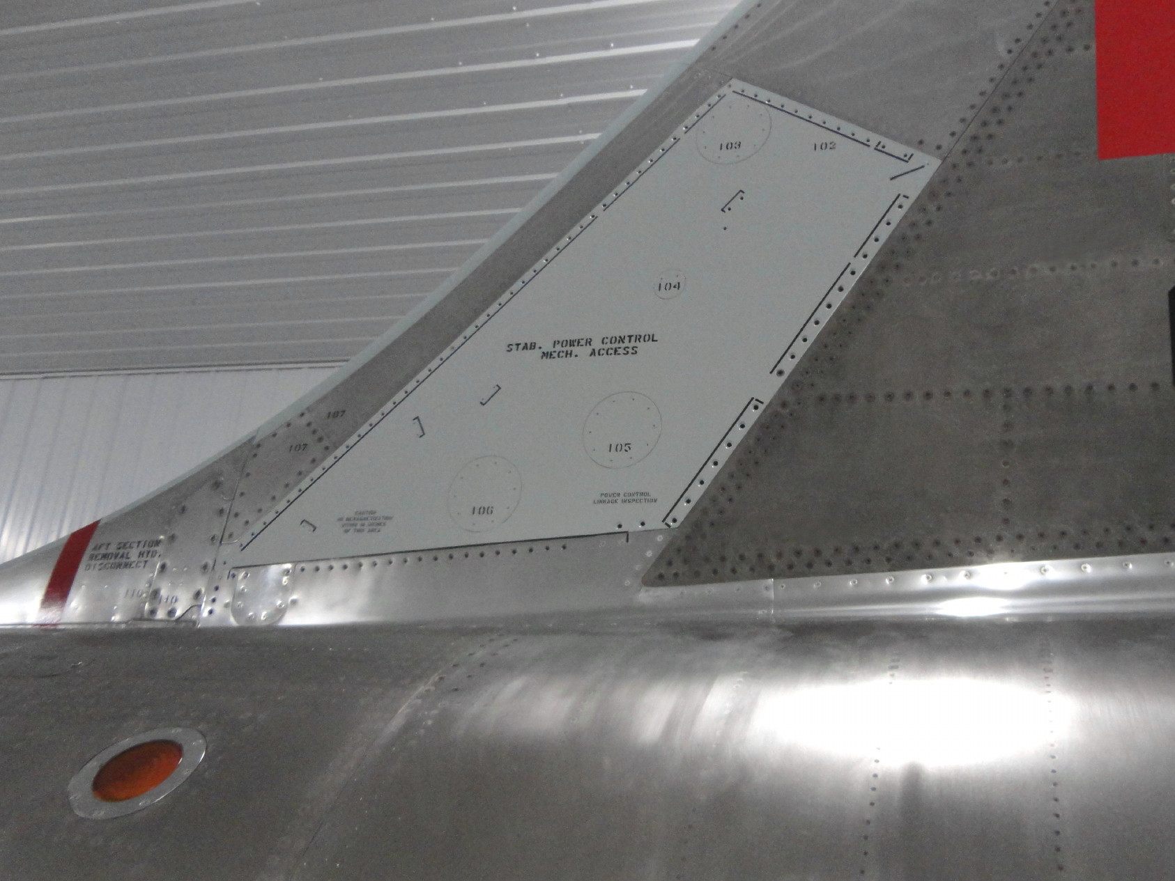 The aircraft is now on jacks as we restore the main landing gear and wheel wells. The tires we received from the Starfighters Team were cleaned and refurbished along with the brakes then installed on the newly restored rims. The ventral fin was polished and the arrestor hook stripped and painted. The next step is to polish all the main gear doors and paint the insides then overhaul the main hydraulic rams and liquid spring oleo shocks. When all is complete we will put the main gear back together and install the tires. The hope is to have this done in the next month so that we can continue and hopefully finish the main fuselage skin polishing. We require the gear to be done so that we can roll it outside to polish.